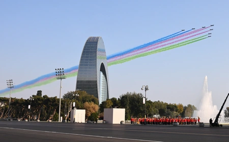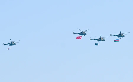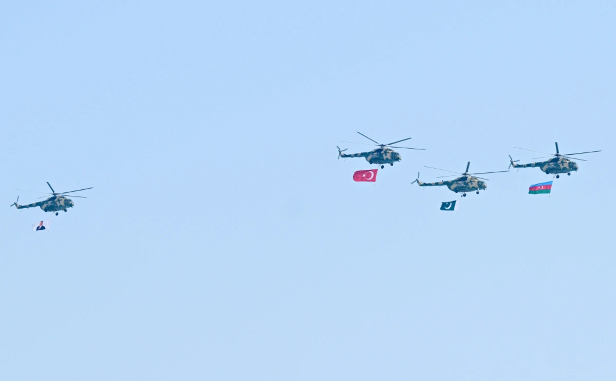 Azərbaycan və Türkiyə pilotlarının iştirakı ilə aviasiya nümayiş uçuşları isə izləyicilər üçün unudulmaz olub. Parad çərçivəsində uçan Mİ-17 döyüş-nəqliyyat helikopterləri Azərbaycan, Türkiyə və Pakistan respublikalarının Dövlət bayraqlarını daşıyıb, Mİ-17 helikopteri Ümummilli Lider Heydər Əliyevin portretini nümayiş etdirib. Həmçinin uzaqmənzilli hava-yer tipli raketlərlə təchiz olunmuş Mİ-17 döyüş-nəqliyyat helikopterləri, MFİ-17 təlim təyyarələri, L-39 təlim təyyarələri, İL-76 hərbi-nəqliyyat və silahlanmaya yeni qəbul edilmiş C-27J yük təyyarələri, silahlanmaya yeni qəbul edilmiş JF-17 (Cİ EF) çoxməqsədli qırıcı təyyarələr, Türkiyə Hərbi Hava Qüvvələrini təmsil edən F-16 çoxməqsədli qırıcı təyyarələr, modernizasiya olunmuş SU-25-Laçın hücum təyyarələri iftixar dolu hislər yaşadıb. SU-25 hücum təyyarələri isə Azərbaycan Bayrağının rənglərini paytaxt səmasında canlandırıb.