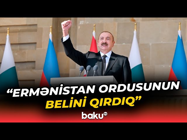 Beş il bundan əvvəl Zəfər paradında da əziz qardaşım Rəcəb Tayyib Ərdoğan bizimlə bərabər idi. Bu gün isə bizimlə bərabər digər əziz qardaşım iştirak edir. Qardaş Pakistanın Baş naziri Məhəmməd Şahbaz Şərif bizim qonağımızdır. Pakistan dövləti və xalqı 44 günlük Vətən müharibəsi zamanı Azərbaycana dəstək və həmrəylik göstərmişdir. Bu gün ilk dəfə olaraq Azadlıq meydanında Pakistan hərbçiləri də bizimlə bərabər iştirak edirlər. Bu, üç ölkənin - Azərbaycan, Türkiyə, Pakistan xalqlarının, ordularının birliyinin təzahürüdür.