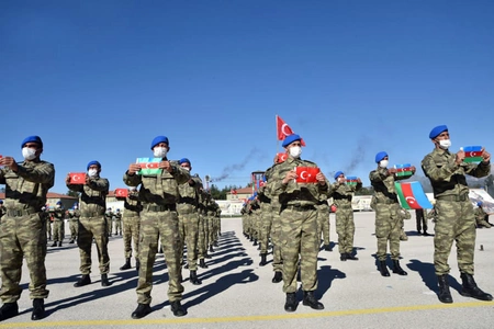 "Report" Müdafiə Nazirliyinə istinadən xəbər verir ki, bu münasibətlə keçirilən mərasimdə əvvəlcə Türkiyə və Azərbaycan Respublikalarının Dövlət himnləri səsləndirilib.