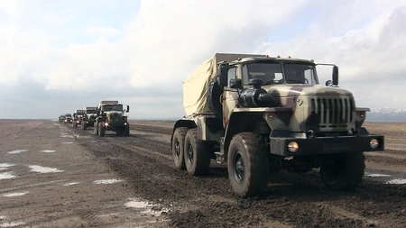 Əməliyyat-taktiki təlimlərin niyyətinə uyğun olaraq daimi dislokasiya məntəqələrini həyəcan siqnalı ilə tərk edən raket və artilleriya bölmələri təyin edilmiş marşrutlarla hərəkət edir.