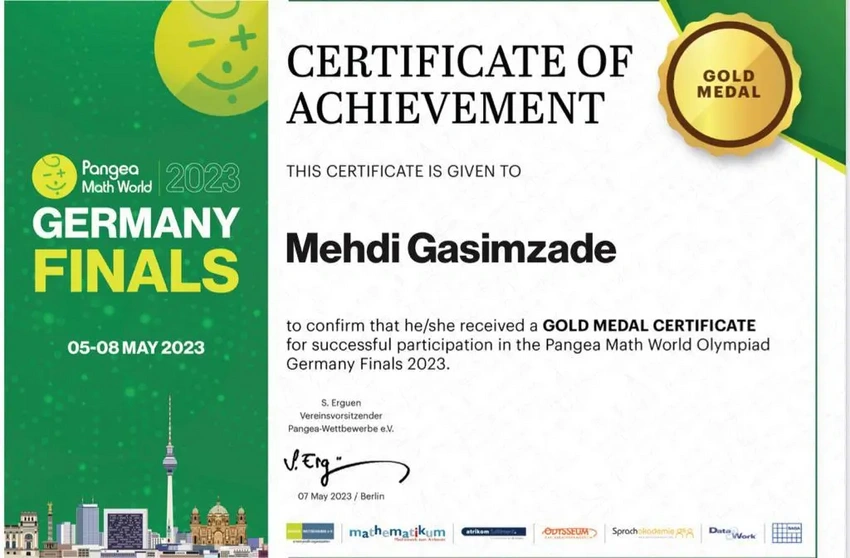 Məlumat üçün onu da bildirək ki, Mehdi Qasımzadə 2023-cü ilin 5-8 may tarixlərində Almaniyanın paytaxtı Berlin şəhərində keçirilmiş "Pangea math world" beynəlxalq riyaziyyat olimpiadasının qalibi olub.