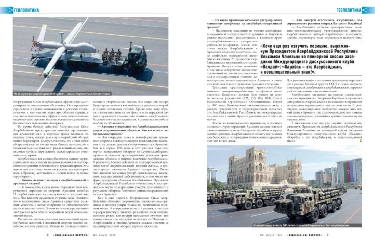 Rusiyanın “Nasionalnaya oborona” jurnalının avqust buraxılışında Azərbaycan Respublikası Prezidentinin köməkçisi, Azərbaycan Respublikası Prezidenti Administrasiyasının Xarici siyasət məsələləri şöbəsinin müdiri Hikmət Hacıyevin bu il iyulun 12-də Ermənistan silahlı qüvvələrinin Azərbaycan-Ermənistan sərhədinin Tovuz rayonu istiqamətində törətdiyi hərbi təxribat barədə müsahibəsi dərc olunub.