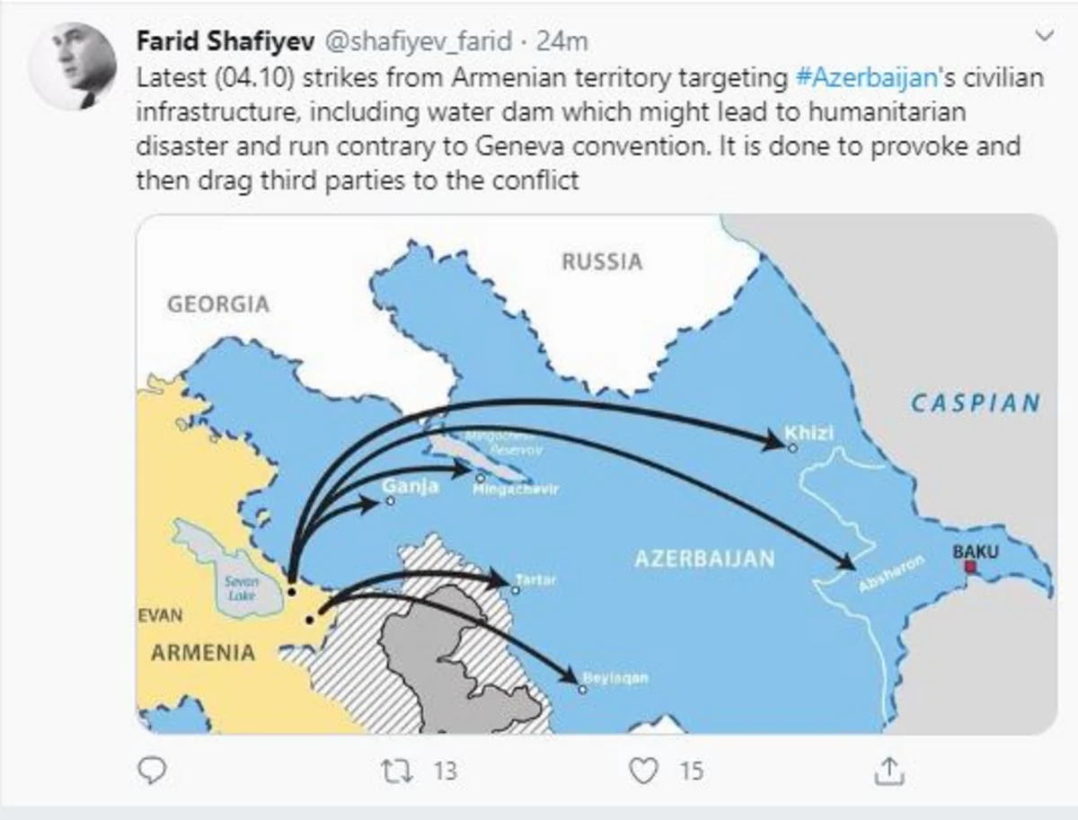 “Ermənistan ərazisindən Azərbaycanın mülki infrastrukturunu, o cümlədən humanitar fəlakətə səbəb ola biləcək su bəndini hədəf alan ən son hücumlar Cenevrə Konvensiyasına ziddir”.