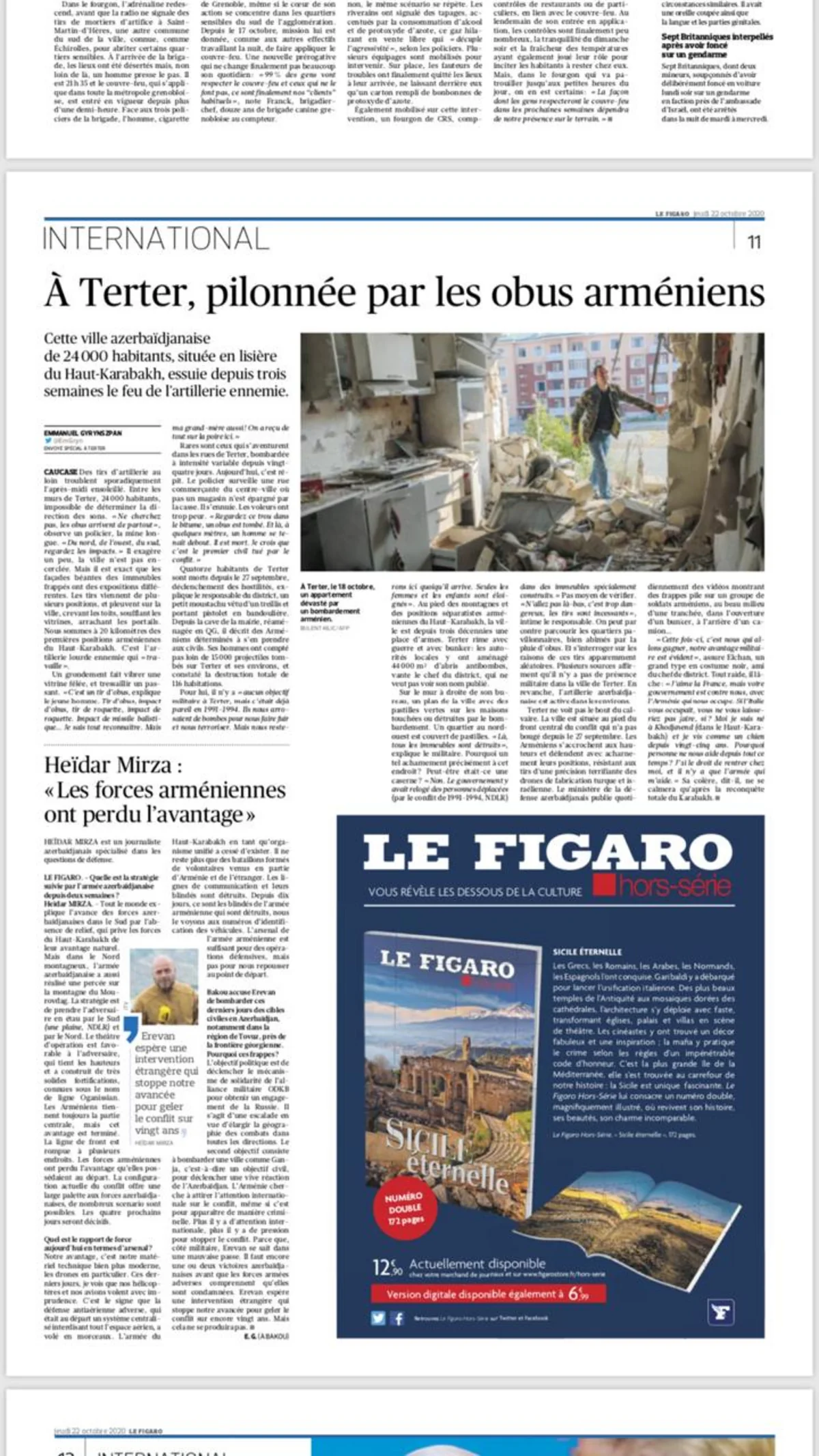Fransanın "Le Figaro" nəşri Ermənistan silahlı qüvvələrinin Tərtərin mülki əhalisini durmadan atəşə tutması barədə xüsusi məqalə dərc edib. Məqalənin müəllifi nəşrin Tərtərə ezam olunmuş xüsusi müxbiri Emmanuel Gyrynszpandır.