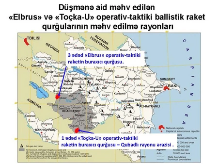 İ.Əliyev düşmənin silahlanmasında olan taktiki və operativ taktiki raket sistemlərinin hədləri barədə fotoslaydlar əsasında məlumat verərək diqqətə çatdırıb ki, oktyabrın 11-də Mingəçevir və Gəncə şəhərlərinə zərbələr endirilib. Fotoşəkillərdən də göründüyü kimi, əgər bu raket atılsaydı, o hətta Bakının da ətrafına düşə bilərdi. Burada böyük infrastrukturlar daxil olmaqla zərbə endirilə bilərdi. Ötən gün bu sistemlər Dağlıq Qarabağ ərazisinə keçsəydi, həmin sistemlərin atəş məsafəsi Bakını da ötə bilərdi. Əldə olunan kəşfiyyat məlumatları əsasında müəyyənləşdirilib ki, Ermənistan tərəfindən atılan “Toçka-U” raketi Xankəndi ətrafındakı Ballıca yaşayış məntəqəsinin yanından start mövqe tutaraq oradan zərbə endirib. Mülki yaşayış məntəqələrimizə atılan bu ballistik raketlərin bir hissəsi Azərbaycan Hərbi Hava Qüvvələrinin hava hücumundan müdafiə bölmələri tərəfindən vaxtında aşkarlanaraq məhv edilib. Amma səmərəli mübarizə ondan ibarətdir ki, həmin ballistika raketlərin buraxıcı qurğuları raketlər buraxılmamışdan əvvəl yerdə məhv edilməsini nəzərə alaraq Azərbaycan Ordusu ballistik raketlərin buraxıcı qurğularına və onları dəstəkləyən infrastruktura qarşı müxtəlif növ kəşfiyyat və zərbə vasitələrindən istifadə edərək xüsusi əməliyyatlara başlayıb. Beləliklə, ballistik raketlərə qarşı xüsusi əməliyyatların nəticəsində oktyabrın 12-də saat 14 radələrində işğal altındakı Qubadlı rayonu ərazisində bir ədəd “Toçka-U” raketi məhv edilib. Oktyabrın 14-də gecə saat 01 radələrində iki ədəd və səhər 08:30 radələrində bir ədəd olmaqla ümumilikdə üç ədəd “Elbrus” ballistik raket qurğusunun raketləri ilə birlikdə ordumuz tərəfindən aşkarlanaraq məhv edilib.