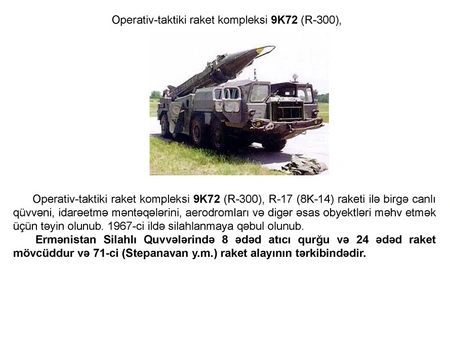 General-mayor bildirib ki, 300 kilometr atış məsafəsinə malik “Elbrus” ballistik raketi kifayət qədər ön cəbhəyə gətirildiyi zaman Bakı şəhərinə çatacaq uçuş məsafəsinə də malikdir. Əgər Dağlıq Qarabağ ərazisinə o gətirilsəydi, hansı dağıntılara səbəb ola biləcəyi aydın təsəvvür etmək mümkündür. Əldə edilmiş kəşfiyyat məlumatları əsasında Dağlıq Qarabağda yerləşən 1-ci ümumqoşun ordusunun tərkibində belə hərbi hissənin olmadığını bilirik. Bu silah Ermənistanın 71-ci raket alayının tərkibindədir. Həmin hərbi hissə Stepanavan şəhərində yerləşir.