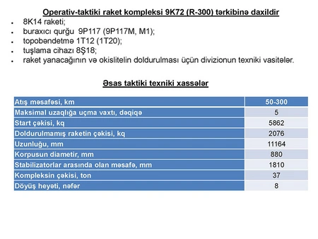 Müdafiə Nazirliyindən "Report"a verilən məlumata görə, general-mayor 9K72 operativ-taktiki raket kompleksinin (OTZK) 8K14 raketi ilə birgə canlı qüvvəni, idarəetmə məntəqələrini, aerodromları və digər əsas obyektləri məhv etmək üçün təyin olunduğunu bildirib.