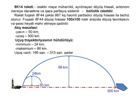 O vurğulayıb ki, 8K14 raketi reaktiv maye mühərrikli, ayrılmayan döyüş hissəli, avtonom idarəetmə və qəza partlayış sistemli ballistik raketdir. Raket fuqaslı 987 kiloqram həcmli partladıcı döyüş hissəsi ilə təchiz olunub. Həmin döyüş hissəsi bir hektara qədər ərazidə döyüş texnikasını və şəxsi heyəti məhv etməyə qadirdir. Uçuş trayektoriyasının hündürlüyü uzaq məsafəyə atılanda 86 kilometr, yaxın məsafəyə atış zamanı isə 24 kilometrdir. Uçuş vaxtı 165-313 saniyədir.
