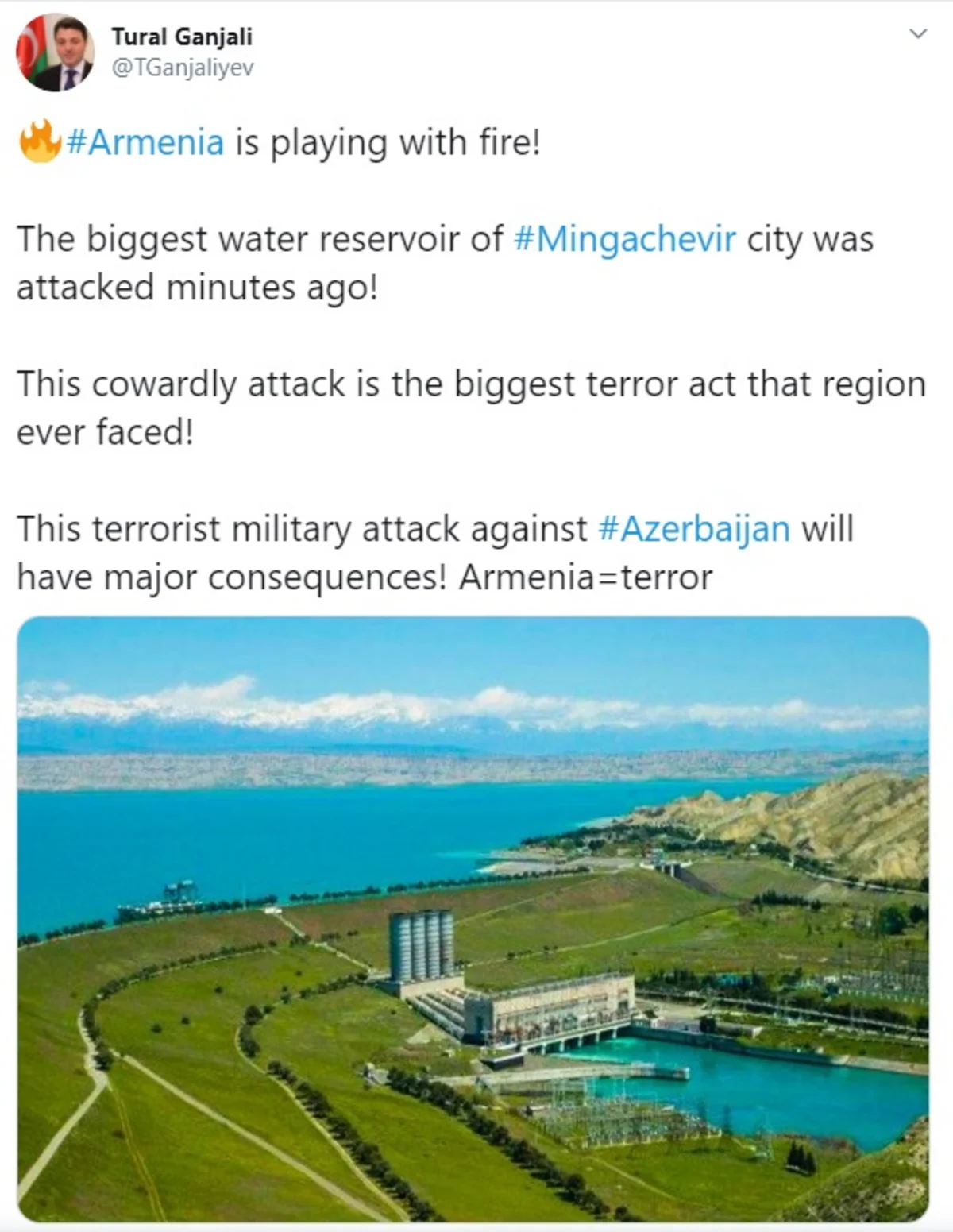 “Ermənistan odla oynayır. Ən böyük su anbarının yerləşdiyi Mingəçevir şəhəri raket atəşlərinə məruz qalıb. Bu qorxaq hücum bölgənin indiyədək üzləşdiyi ən böyük terror aktıdır! Bu terror hücumuna qarşı Azərbaycanın yüksək səviyyədə cavabı olacaq. Ermənistan terror deməkdir”.