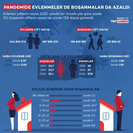 Pandemiya dövründə Türkiyədə qeydə alınan nikah və boşanma hallarının sayı azalıb.