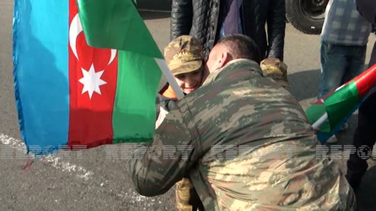 По сообщению южного центра Report, солдат и офицеров встретили овациями под звуки Государственного гимна Азербайджана и со словами "Наша армия - самая могучая!", "Карабах - это Азербайджан!".