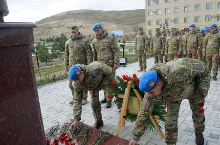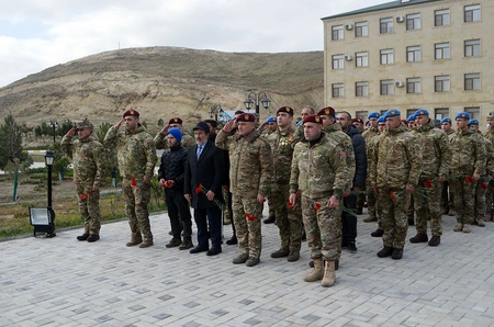 Прозвучал Государственный гимн. Участники церемонии возложили цветы к бюсту великого лидера Гейдара Алиева и мемориалу Сил спецназа, установленным на территории воинской части. На церемонии по случаю Дня Победы был разрезан торт, ветеранам и детям шехидов были преподнесены различные подарки.