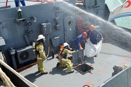 В рамках учений также отработаны практические учения по пожарной готовности корабля на якорной стоянке, правилам оказания первой помощи раненым и их эвакуации.