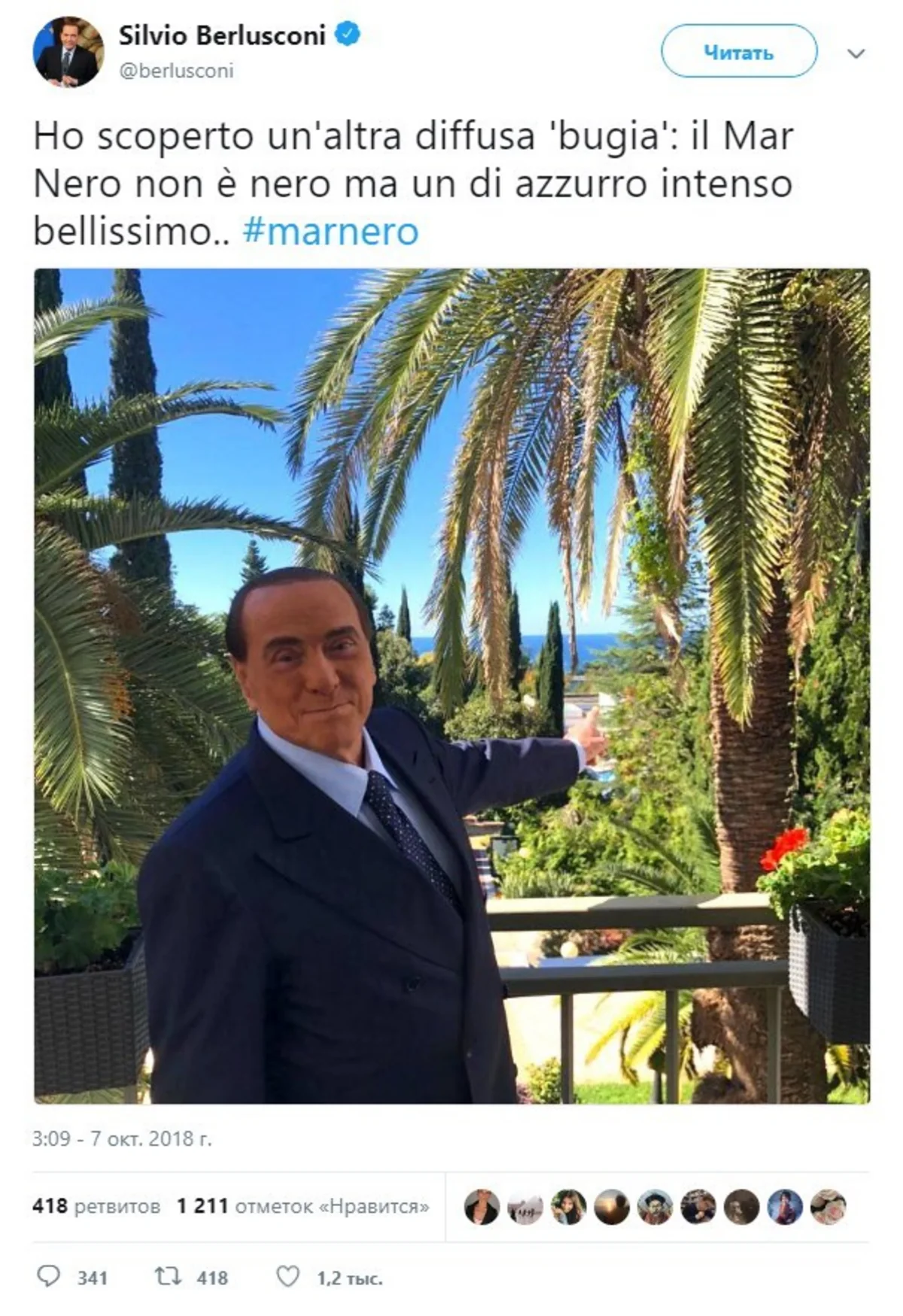 Баку. 7октября. REPORT.AZ/ Бывший премьер-министр Италии Сильвио Берлускони опубликовал в Twitter фотографию с черноморского побережья.