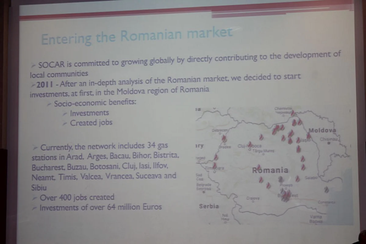 Отмечено, что SOCAR играет ведущую роль на международном энергетическом рынке. Также участники мероприятия были проинформированы о деятельности SOCAR в Румынии, в столице и 17 регионах которой действуют 34 АЗС под брендом SOCAR. В то же время отмечено, что компания планирует занять 10% энергорынка Румынии.