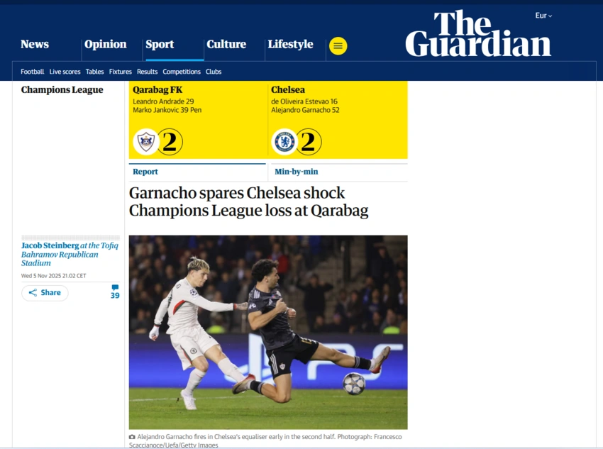 Другое авторитетное издание - "The Guardian" - написало, что аргентинец Алехандро Гарначо спас "Челси" от неожиданного поражения в Лиге чемпионов от "Карабаха":