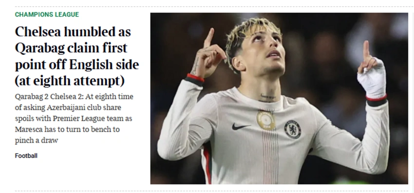 Одно из самых авторитетных британских изданий - "The Times" - вышло с заголовком, в котором чувствуется разочарование игрой "аристократов" и итоговым результатом. Название статьи - "Chelsea humiliated as Qarabag snatch first point from English side" (""Челси" унижен, "Карабах" забирает первое очко у английской команды") - само по себе свидетельствует о грусти британцев итогом матча, так как "Карабах" впервые сыграл вничью с клубом из Британии в рамках европейских клубных турниров.