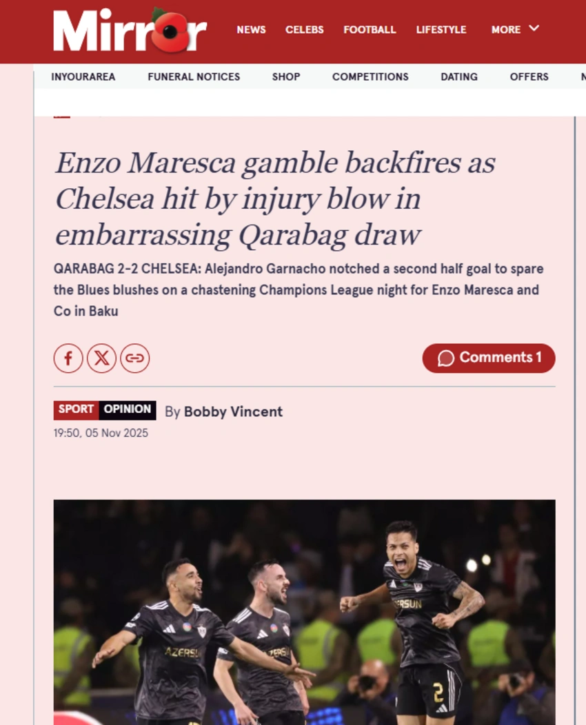 Daily Mail, в свою очередь, в заголовке своего материала отмечает, что ничья между "Карабахом" и "Челси" должна стать уроком для итальянского специалиста (Энцо Марески - ред.) и английской команды. Автор статьи не скрывает разочарования результатом встречи. При этом автор попытался "свалить" всю вину за неудачи "Челси" на судью матча: