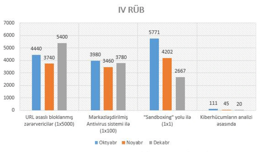 За 4-ый квартал в сети AzStateNet брандмауэрами заблокировано 67 900 000 вредоносных ссылок, централизованной антивирусной системой - 1 122 000 вредоносных файлов, песочницей (sandbox) - 12 640 вредоносных файлов, в результате детектирования целевых кибератак заблокировано 176 специальных индикаторов.
