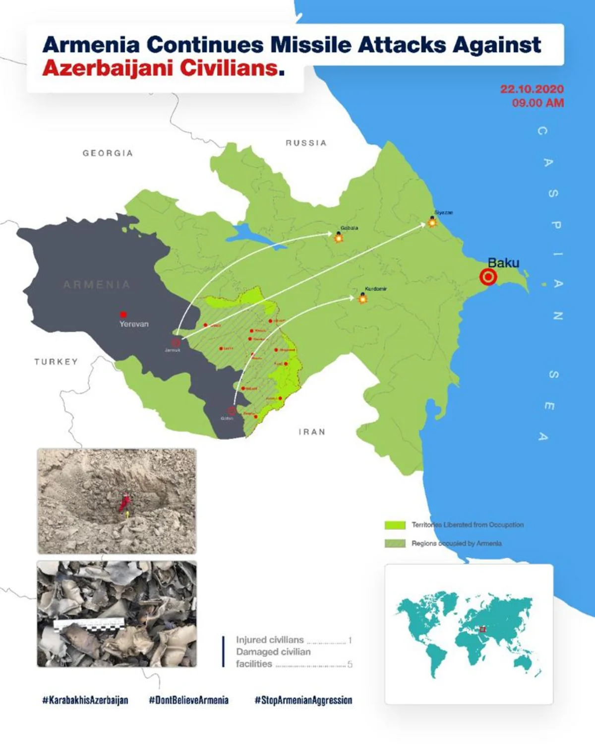 Коварный враг регулярно подвергает обстрелу наши населенные пункты, каждый день наши прифронтовые города, села подвергаются обстрелу. Больше всего подлому нападению подвергается Тертерский район, Агдам, Геранбой, Агджабеди, Барда. Но вражеские оккупанты на этом не останавливаются. В результате беспощадного ракетного обстрела второго по численности населения города Азербайджана – Гянджа, который находится далеко от поле боя погибли мирные жители – дети, женщины, старики. Враг целится не на военные объекты, а на жилые массивы, тем самым показывает свою фашистскую сущность Они совершают на глазах у всего мира преступление против гражданского населения, нарушая Женевскую конвенцию. В направлении мирных городов Азербайджана выпускаются баллистические ракеты – Габала, Сиязань, Кюрдамир подверглись сегодня атаке баллистических ракет.