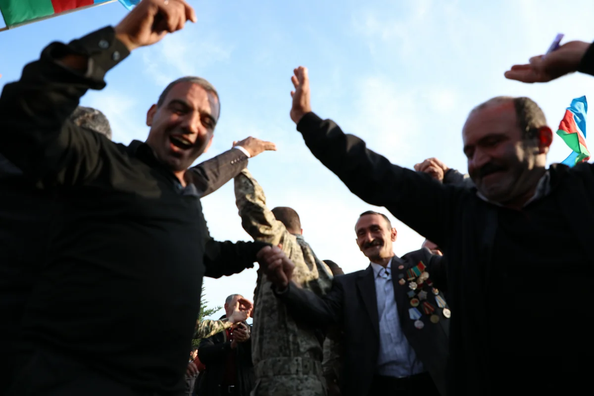 Так, люди празднуют победу в поселке Шыхарх. Жители поздравляют друг друга, звучат лозунги и люди танцуют под звуки музыки.