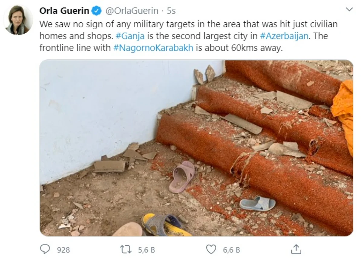 "Гянджа - второй по величине город Азербайджана. Он расположен примерно в 60 км от нагорно-карабахского фронта", - добавил она.