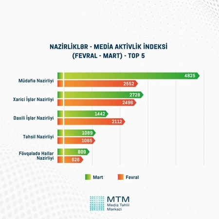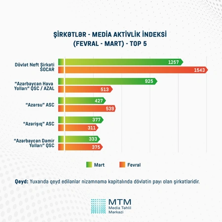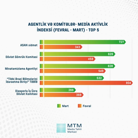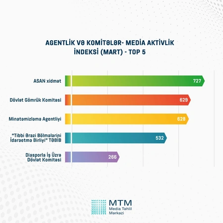 Как сообщает Report, согласно индексу медиаактивности, самыми активными структурами в СМИ среди министерств является министерство обороны, среди агентств и комитетов - ASAN Service, среди государственных компаний - SOCAR.