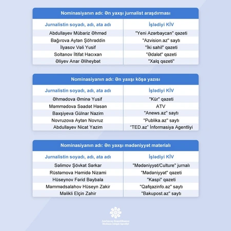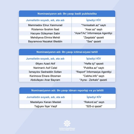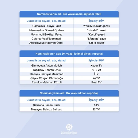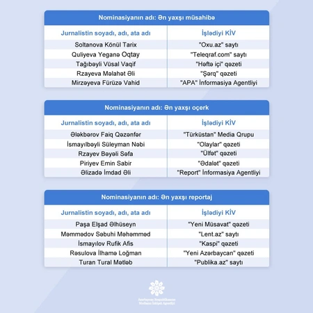 Как сообщает Report, победителями конкурса стали два сотрудника Информационного агентства Report, один сотрудник портала "Oxu.az", три сотрудника газеты "Kaspi".