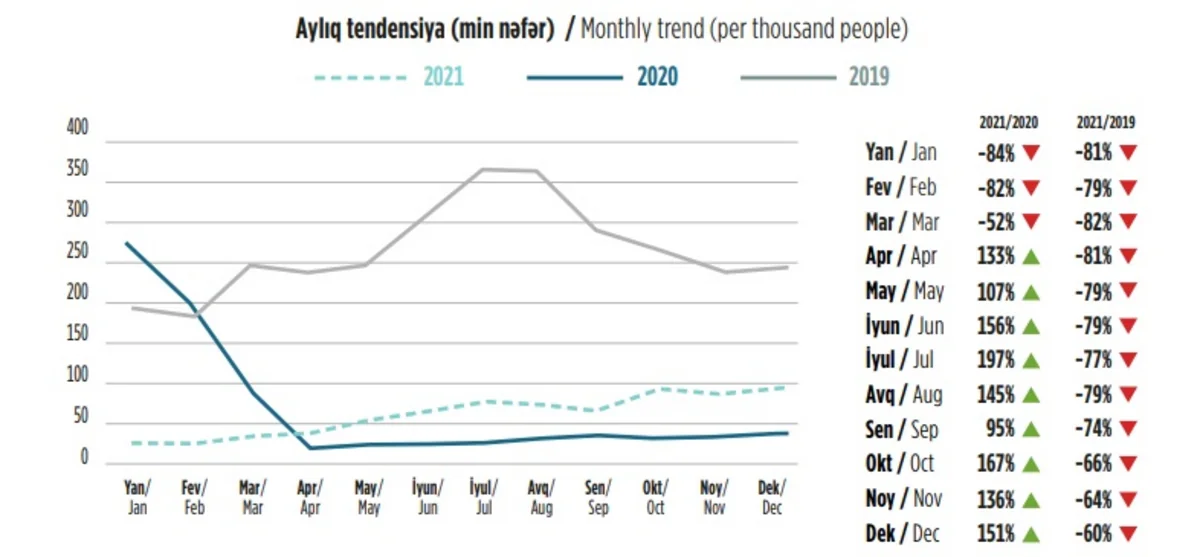 Хотя в январе, феврале и марте 2021 года по сравнению с аналогичным периодом 2020 года число туристов сократилось на 84%, 82% и 52% соответственно, в апреле было зарегистрировано увеличение на 133%, в мае - на 107%, в июне - на 156%, в июле - на 197%, в августе - на 145%, в сентябре - на 95%, в октябре - на 167%, в ноябре - на 136%, в декабре - на 151%.