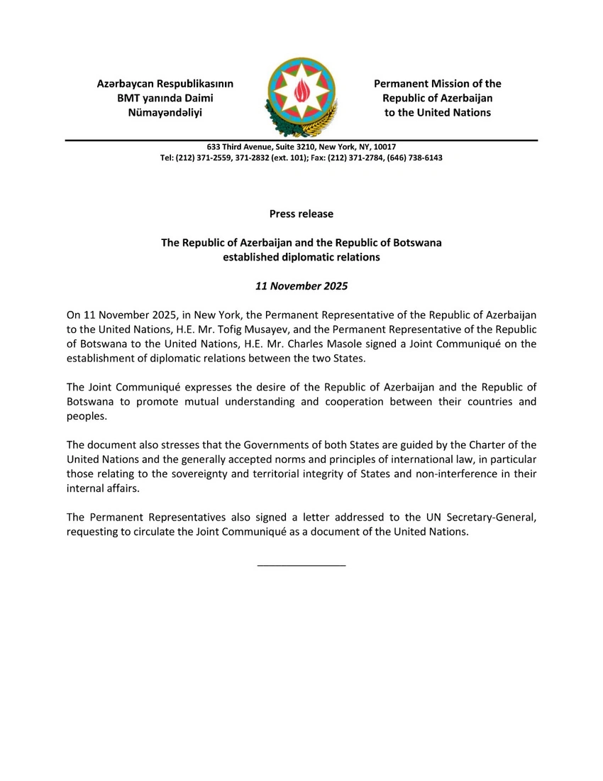 "11 ноября 2025 года в Нью-Йорке постоянный представитель Республики Азербайджан при ООН Тофик Мусаев, и постоянный представитель Республики Ботсвана при ООН Чарльз Масоле подписали Совместное коммюнике об установлении дипломатических отношений между двумя государствами", - говорится в сообщении.