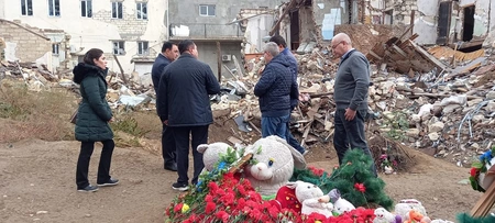 Гость в знак уважения к памяти погибших возложил цветы к разрушенному месту.