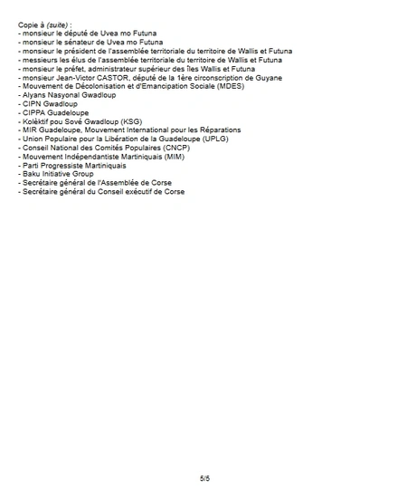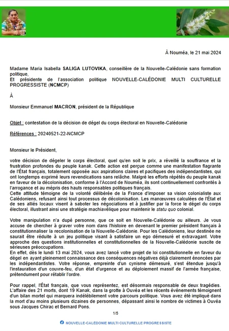 Автор письма указывает на ответственность Франции и, в частности, Макрона за трагедию, произошедшую в Новой Каледонии, в частности, на убийство канаков. Салига-Лутовика подчеркнула, что представители канакской молодежи были убиты местными силовиками, действовавшими при поддержке французского правительства, в частности французских правоохранительных органов. Депутат заявила, что эти отряды силовиков порождают расовую вражду в ее стране.