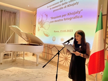 Затем 13-летняя представительница азербайджанской общины Италии Ильдуза Садыхова представила вниманию участников мероприятия на итальянском языке рассказы из посвященной жертвам Ходжалинского геноцида книги «Они никогда не вырастут», автором которой является свидетель Ходжалинского геноцида Сария Муслим гызы Джафарова.
