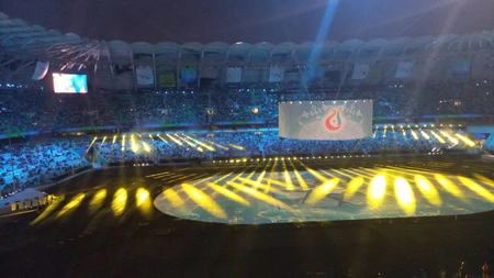 Восемь атлетов, чьи имена золотыми буквами вписаны в спортивную историю Турции, - дзюдоистка Хюлья Шенъюрт, таэквондистка Нур Татар, борец Ясемин Адар, каратистка Мерве Чобан, тяжелоатлет Халиль Мутлу, таэквондист Сервет Тазегюль и борец Мехмет Акиф Пирим вынесли на стадион флаг Спортивной федерации исламской солидарности (ISSF).