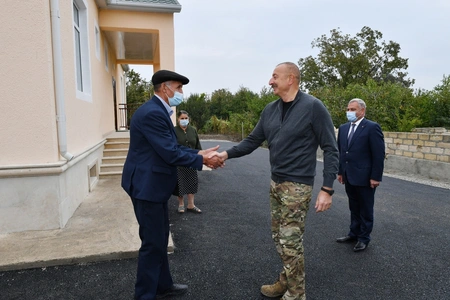 Президент Азербайджана Ильхам Алиев посмотрел дом жителя города Тертер Сахиба Исмайлова, разрушенный во время Отечественной войны в результате атаки армянских вооруженных сил с использованием ракет "Смерч", и ознакомился с условиями, созданными в построенном вместо него новом доме.