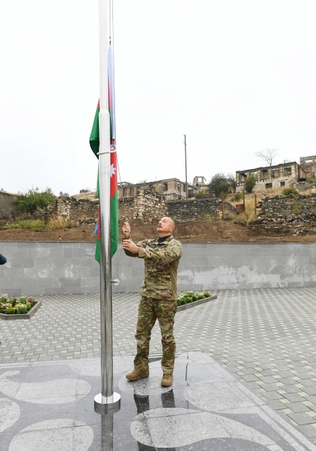 Верховный главнокомандующий водрузил азербайджанский флаг в селе Талыш и поселке Суговушан Тертерского района. Президент Азербайджана посетил разрушенные армянами албанско-удинскую и православную церкви в селе Талыш.