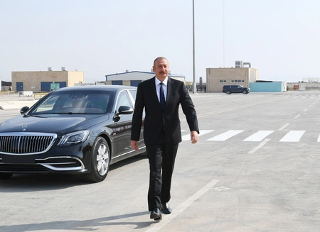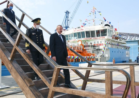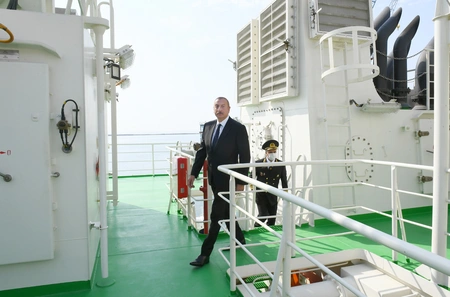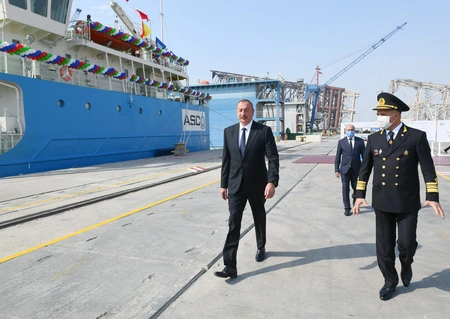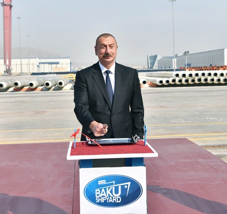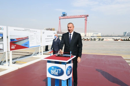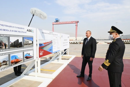 Президент Азербайджана Ильхам Алиев принял участие в церемонии сдачи в эксплуатацию нефтеналивного танкера «Кяльбаджар» на Бакинском судостроительном заводе.