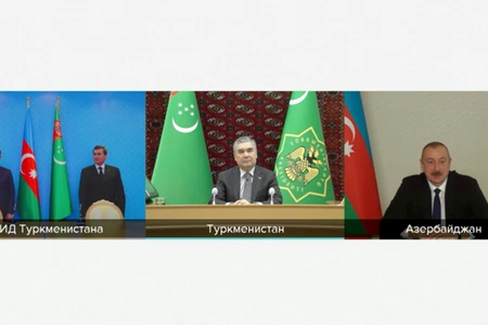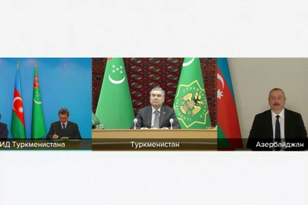Состоялась встреча между президентом Азербайджана Ильхамом Алиевым и президентом Туркменистана Гурбангулы Бердымухамедовым в формате видеоконференции в связи с подписанием между правительством Азербайджанской Республики и правительством Туркменистана Меморандума о взаимопонимании о совместной разведке, разработке и освоении углеводородных ресурсов месторождения "Достлуг" на Каспийском море.