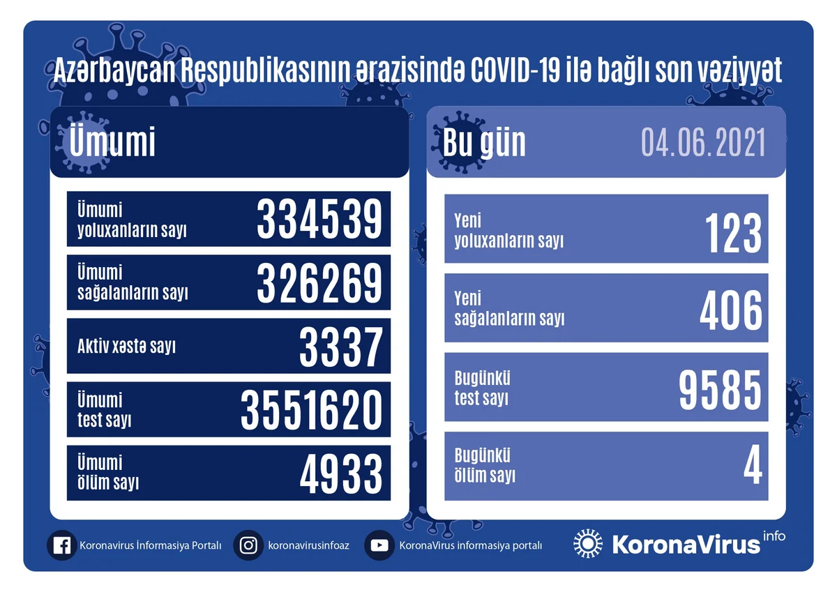 Azərbaycanda koronavirus (COVID-19) infeksiyasına 123 yeni yoluxma faktı qeydə alınıb, 406 nəfər müalicə olunaraq sağalıb.
