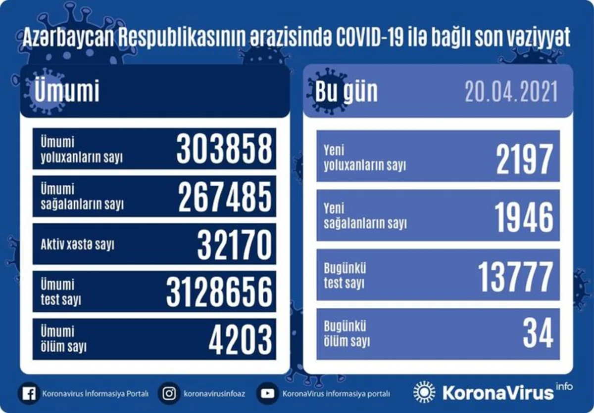 Son sutka ərzində yeni yoluxma hallarının müəyyənləşdirilməsi ilə əlaqədar 13 777, bu günə qədər isə ümumilikdə 3 128 656 test icra olunub.