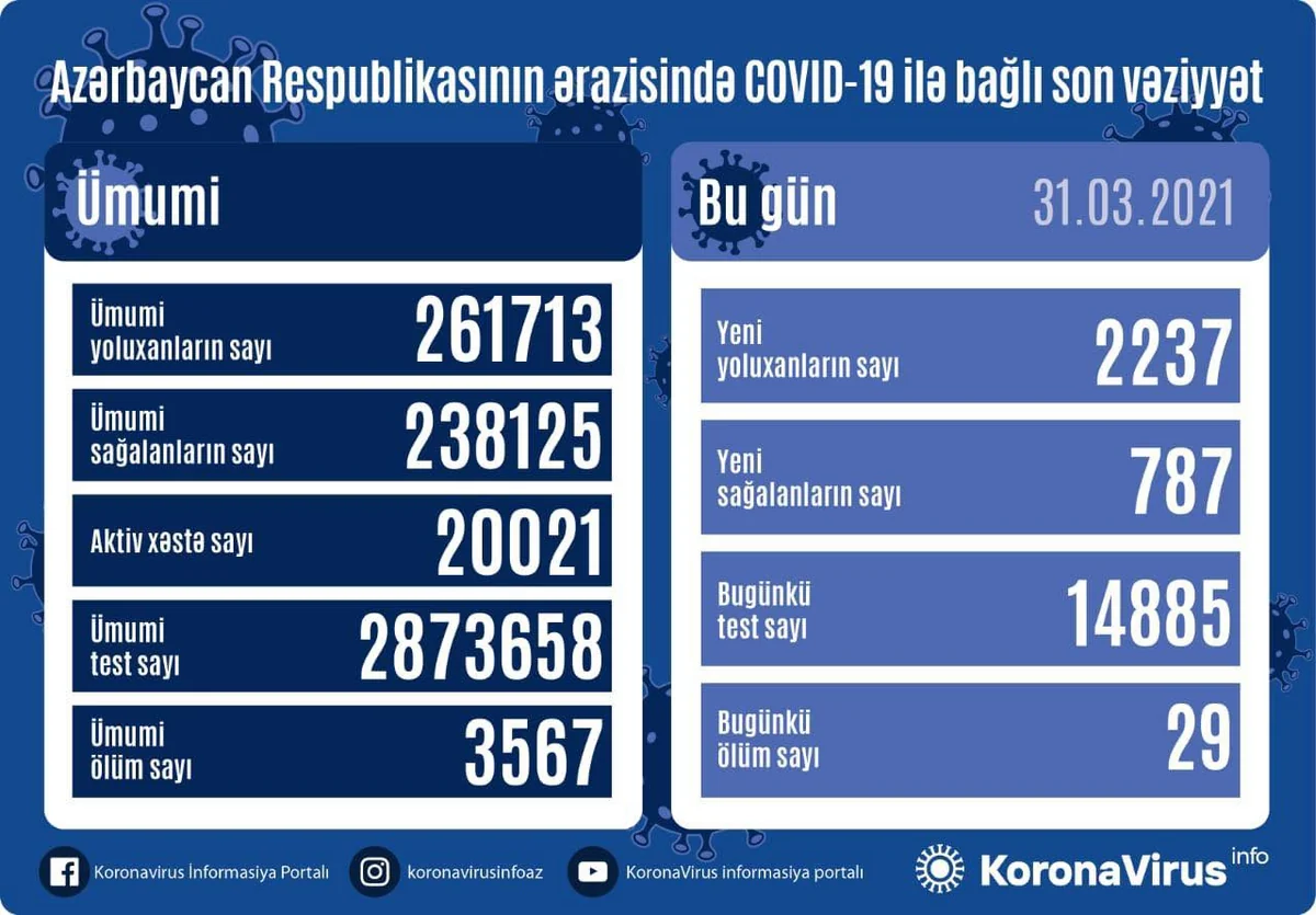 Azərbaycanda indiyədək ümumilikdə 261 713 nəfər koronavirus infeksiyasına yoluxub, onlardan 238 125 nəfər müalicə olunaraq sağalıb, 3 567 nəfər vəfat edib, aktiv xəstə sayı 20 021 nəfərdir.