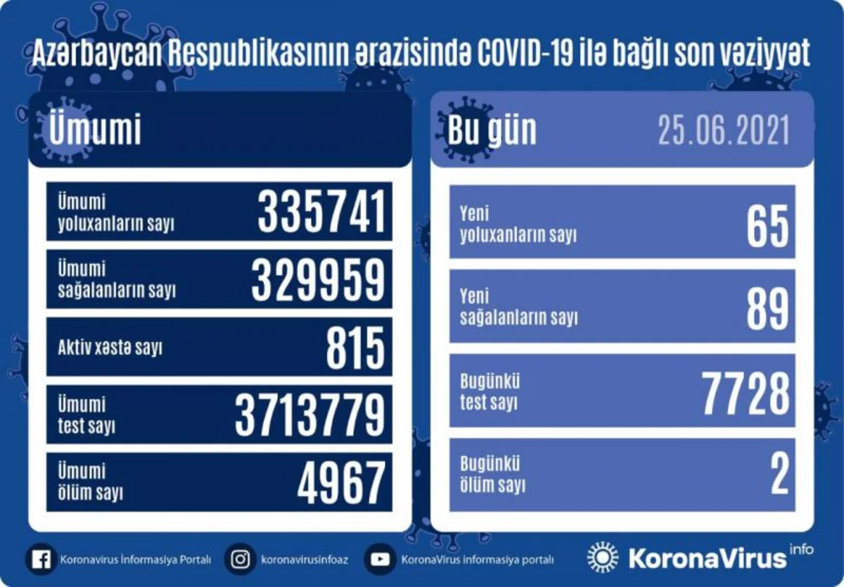Azərbaycanda koronavirus (COVID-19) infeksiyasına 65 yeni yoluxma faktı qeydə alınıb, 89 nəfər müalicə olunaraq sağalıb.