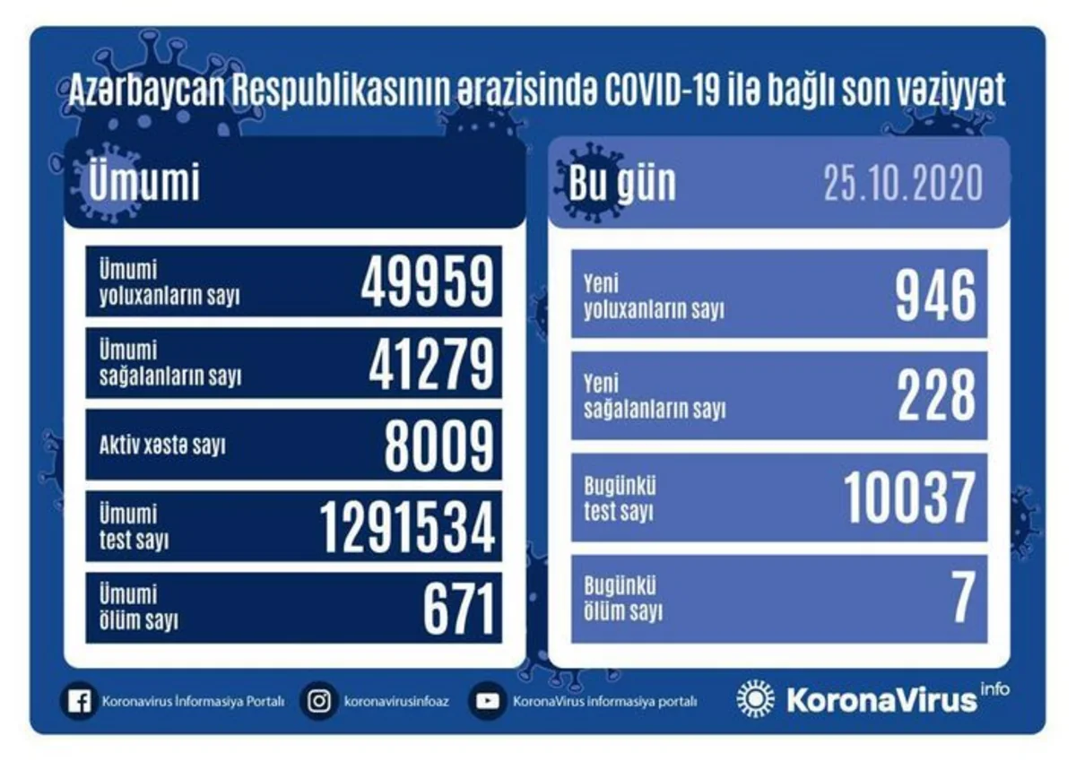 Hazırkı dövrədək ölkəmizdə 49 min 959 nəfərin koronavirus infeksiyasına yoluxması faktı müəyyən edilib. Onlardan 41 min 279 nəfər müalicə olunaraq sağalıb, 671 nəfər vəfat edib. Aktiv xəstə sayı 8 009 nəfərdir.