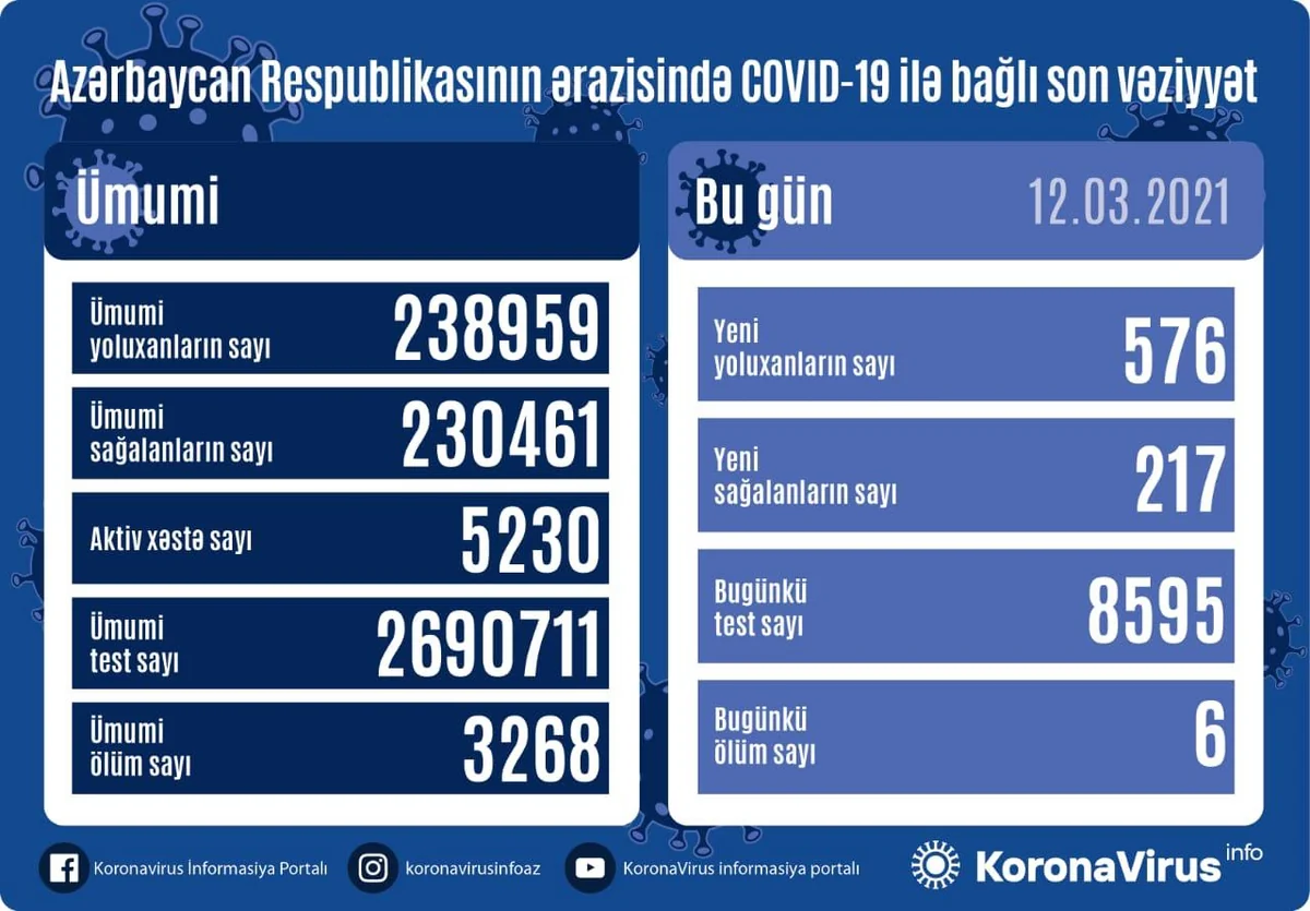 Azərbaycanda koronavirus (COVID-19) infeksiyasına 576 yeni yoluxma faktı qeydə alınıb, 217 nəfər sağalaraq evə buraxılıb.