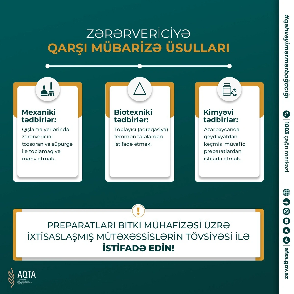 Vurğulanıb ki, zərərvericinin qışlama yerlərini maksimum məhdudlaşdırmaq məqsədilə evlərdə, çardaqlarda, bağlara yaxın tikililərdə vaxtında təmizləmə və təmir işləri aparılmalıdır: