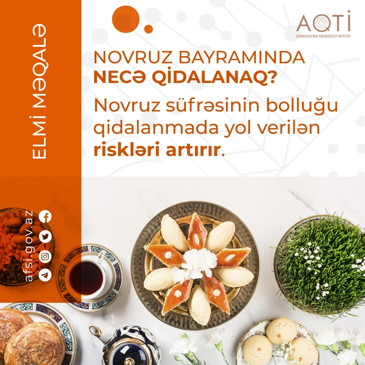 Azərbaycan Qida Təhlükəsizliyi İnstitutunun "Elmi Araşdırmalar Mərkəzi" departamentinin mütəxəssisləri Aynur Həsənova, Xədicə Doldolova "Novruz bayramında necə qidalanaq?" mövzusunda məqalə hazırlayıb.