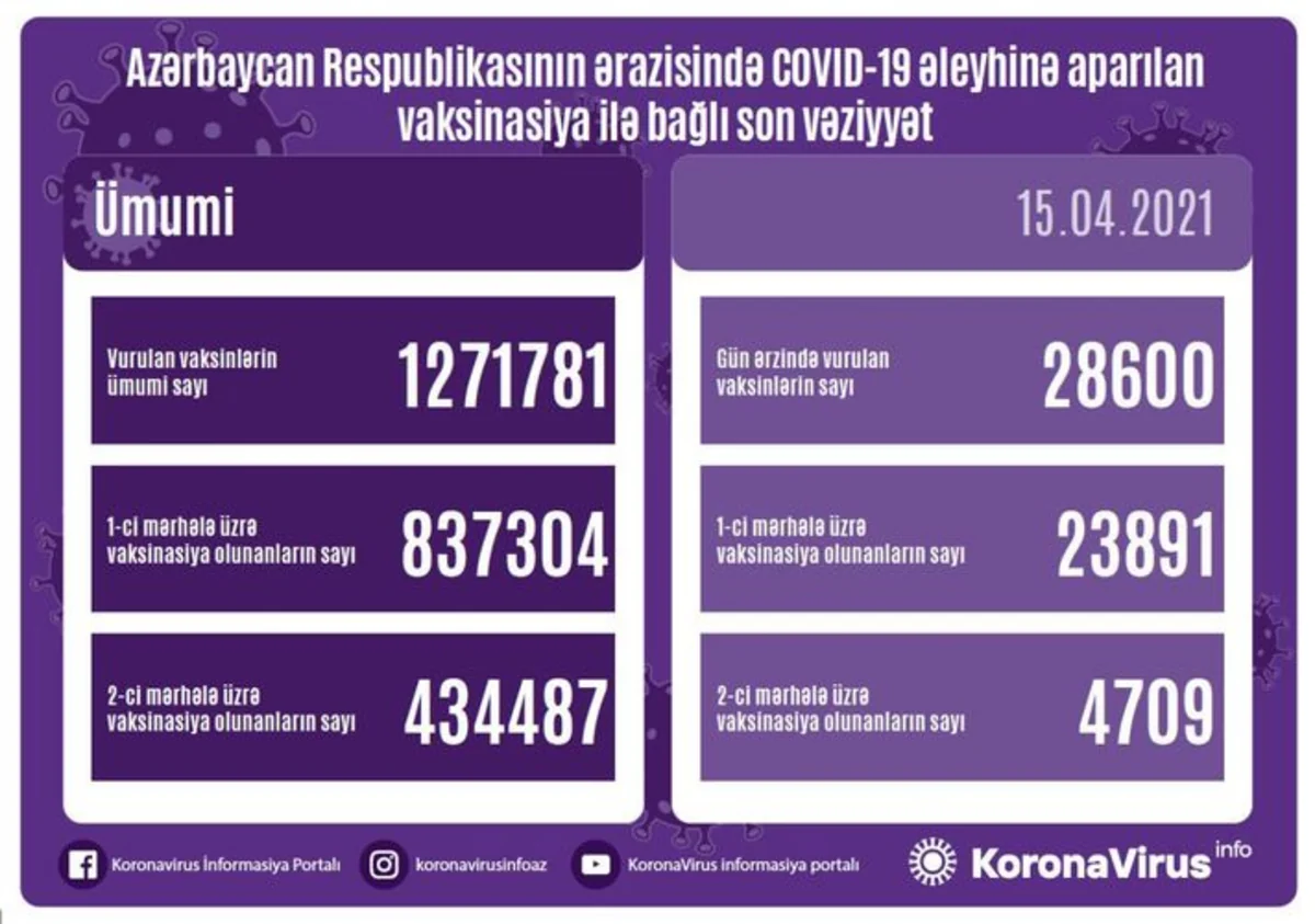 Ölkədə vurulan vaksinlərin ümumi sayı 1 271 781, birinci mərhələ üzrə vaksinasiya olunanların ümumi sayı 837 304, ikinci mərhələ üzrə vaksinasiya olunanların sayı isə 434 487 təşkil edir.