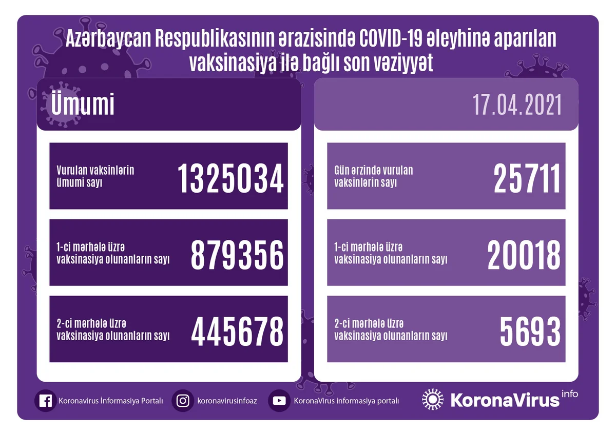 Ölkədə vurulan vaksinlərin ümumi sayı 1 325 034, birinci mərhələ üzrə vaksinasiya olunanların ümumi sayı 879 356, ikinci mərhələ üzrə vaksinasiya olunanların sayı isə 445 678 təşkil edir.