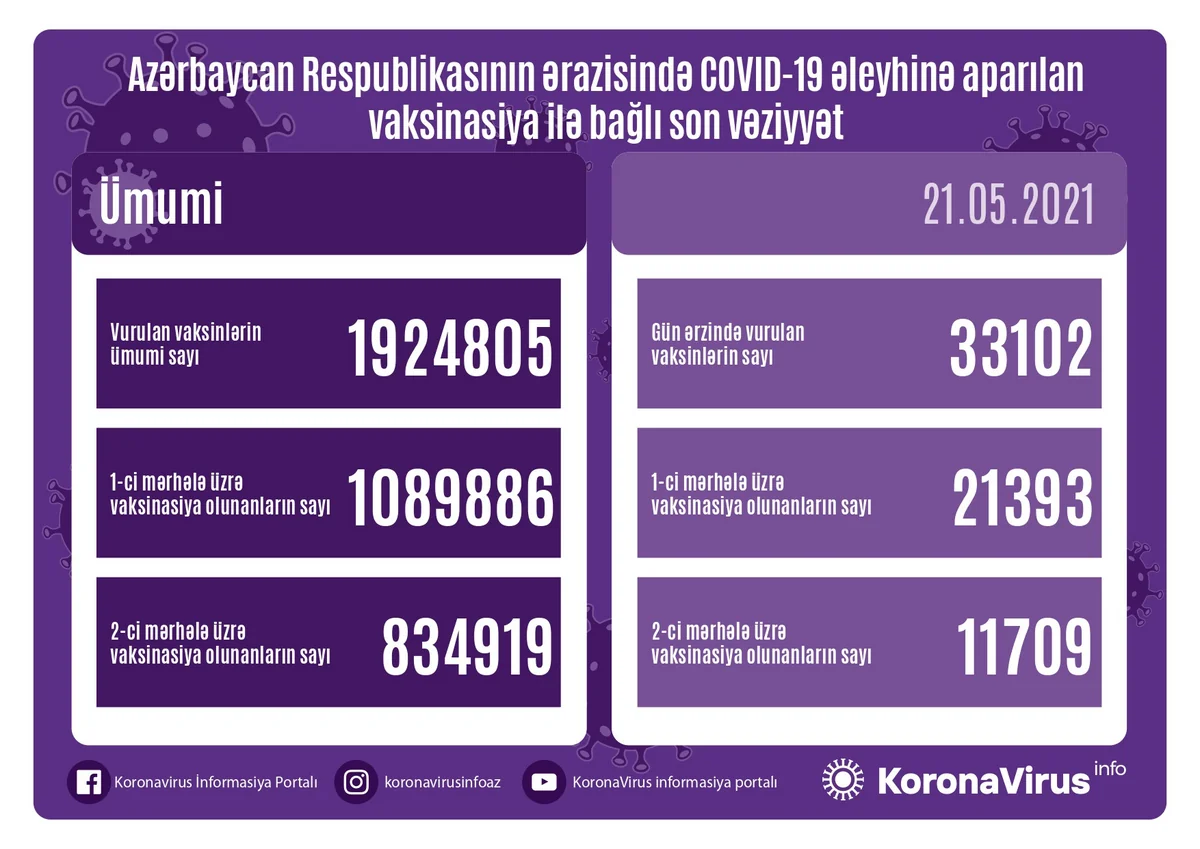 Azərbaycanda bu günə qədər vurulan vaksinlərin ümumi sayı 1 924 805, birinci mərhələ üzrə peyvənd olunanların ümumi sayı 1 089 886, ikinci mərhələ üzrə vaksinasiya edilənlərin sayı 834 919 nəfər təşkil edir.