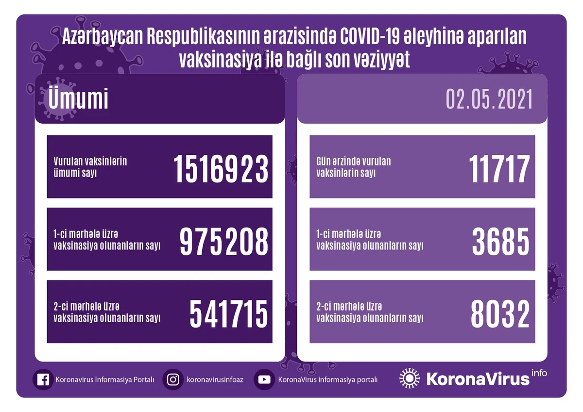 Azərbaycanda bu günə qədər vurulan vaksinlərin ümumi sayı 1 516 923, birinci mərhələ üzrə peyvənd olunanların ümumi sayı 975 208, ikinci mərhələ üzrə vaksinasiya edilənlərin sayı 541 715 nəfər təşkil edir.